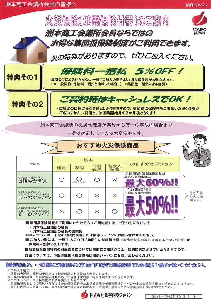 【火災保険(地震保険付帯)】洲本商工会議所会員ならではのお得な集団扱保険制度が利用可能