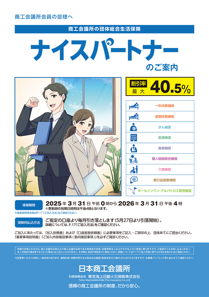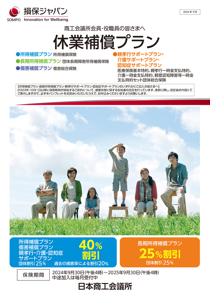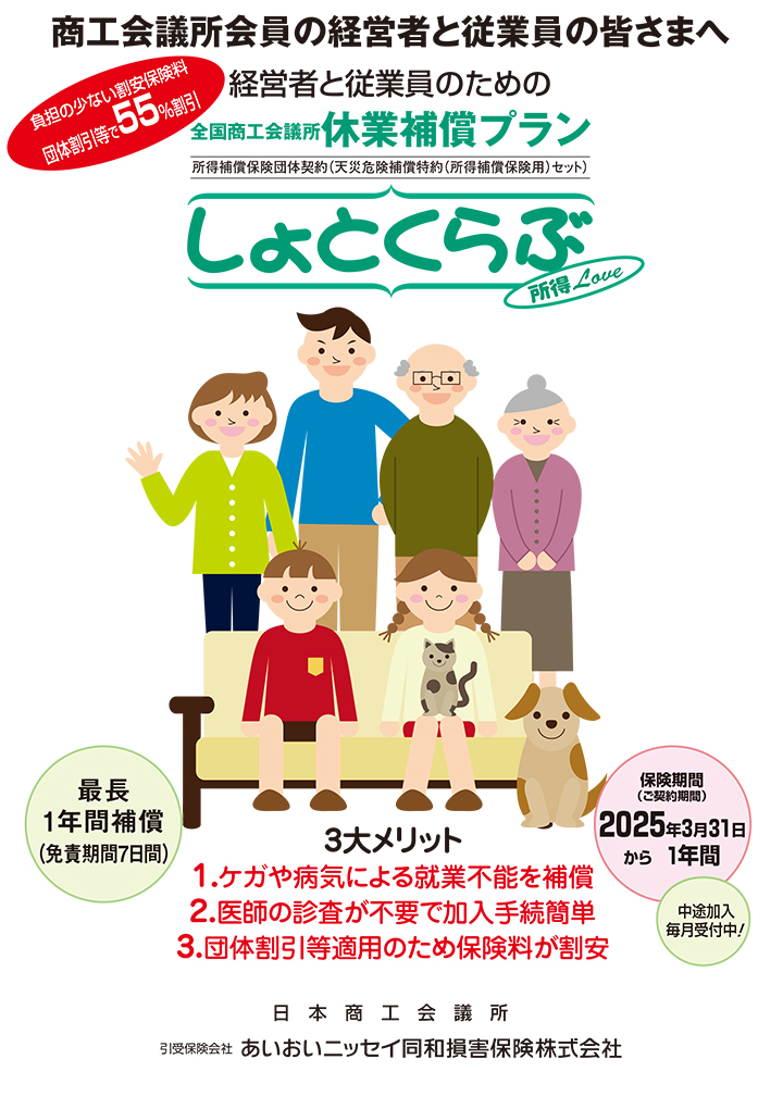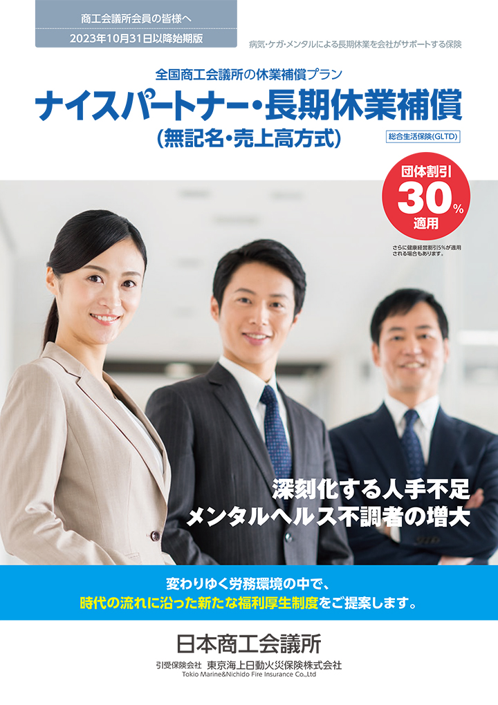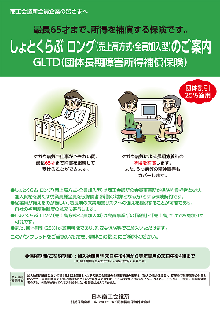 役員や従業員が病気やケガにより就業不能となった場合に日々の収入を補償する制度です。